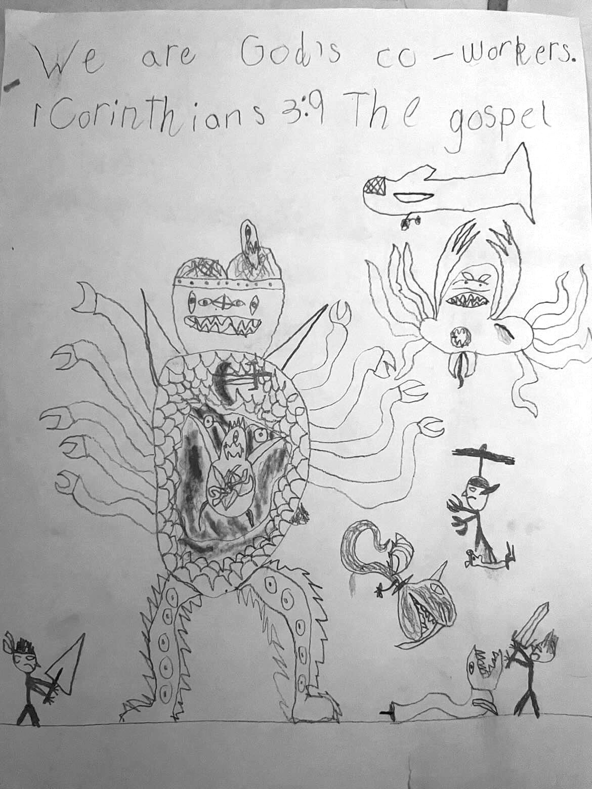 In summation, the visuals that come to my mind have been a part of my creative being since I was young. As depicted in the image on the right, that I sketched during a Sunday school assignment at eight years of age (sans any religious affiliation).